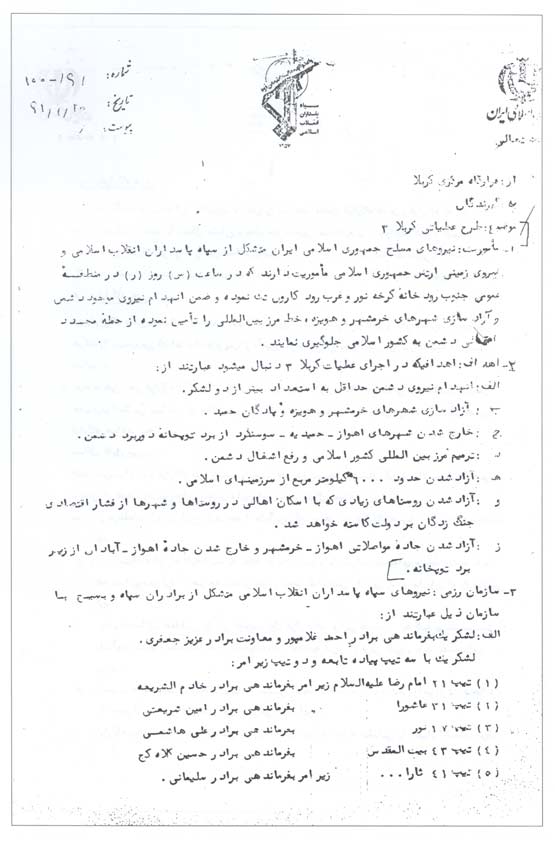 قرارگاه مرکزی کربلا، نخستین طرح عملیاتی کربلا ۳ از سلسله عملیات دوازده گانه مصوب را برای آزادسازی سرزمین اشغالی و فتح کربلا به منظور آزاد سازی خرمشهر، هویزه و پادگان حمید ابلاغ میکند.