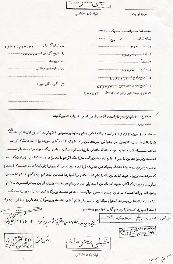 به: 322 تاريخ: 5/8/45 از : 20/هـ/5 شماره: 17531/20 هـ/5 موضوع: اظهارات رضا راننده آقاي نظام امامي درباره تغيير كابينه ساعت 0900 روز 30/7/45 راننده نظام امامي به نام رضا بهطور خصوصي اظهار ميداشت روز قبل خانم نخستوزير كه به اتفاق مادرش با اتومبيل من به خياطي ميرفتند بين راه اظهار داشت آقاي هويدا براي مدت يك ماه از شاهنشاه كسب اجازه نمودهاند كه به اتفاق به اروپا مسافرت نماييم. مادرش گفت موقع مراجعت بازهم نخستوزير خواهد بود يا خير؟ خانم نخست وزير گفت مثل اينكه اگر هم باشد براي مدت كوتاهي زيرا روزي كه نخستوزير مريض بود شاهنشاه به عيادتش تشريف فرما شده بودند من كم و بيش از فرمايشات شاهنشاه فهميدم كه عمر نخستوزيري هويدا بايد نزديك به اتمام باشد. مادرش اظهار داشت من نميدانم چه بگويم نظام امامي ميگويد با وجود اينكه آقاي هويدا داماد من است ولي من در تمام عمر نخستوزيري از اين بيمصرفتر نديدهام و نميدانم چرا شاهنشاه به ديدن چنين شخصي ميآيند. خانم نخستوزير گفت اين هم يك جورش است كه شاهنشاه به اشخاص بيعرضه احترام ميگذارد. سپس از خانم نخستوزير سؤال شد تاريخ مسافرت چه وقت است؟ اظهار داشت تا پانزدهم آبان خواهيم رفت.